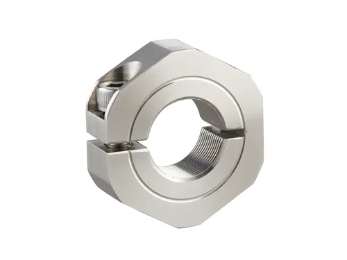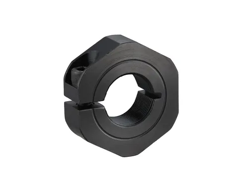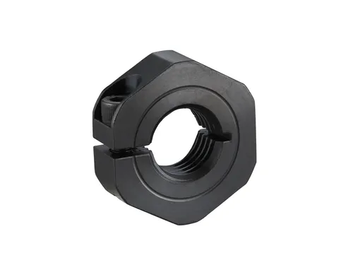 Iwata Slit Shaft Collars provide superior fastening power. They are secured into place with a socket screw on one side. This prevents shaft surfaces from getting scratched. The socket head cap screw is positioned conveniently on its side for easy access. Slit Shaft Collars can accommodate bore diameters from 3mm up to 120mm.