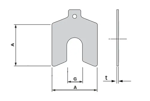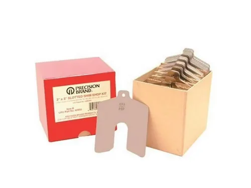 Precision Brand® pre-cut slotted shims are made from a 300 series stainless steel that resists rust and corrosion. Precut shims have tabs that makes shim placement easier and safer, while eliminating the need to place hands under the machinery during installation or removal of shim. Each motor shim is marked with thickness in metric. Precision Brand® Slotted Shim is the best way to solve alignment and leveling problems on motors, pumps, generators, and other plant machinery.