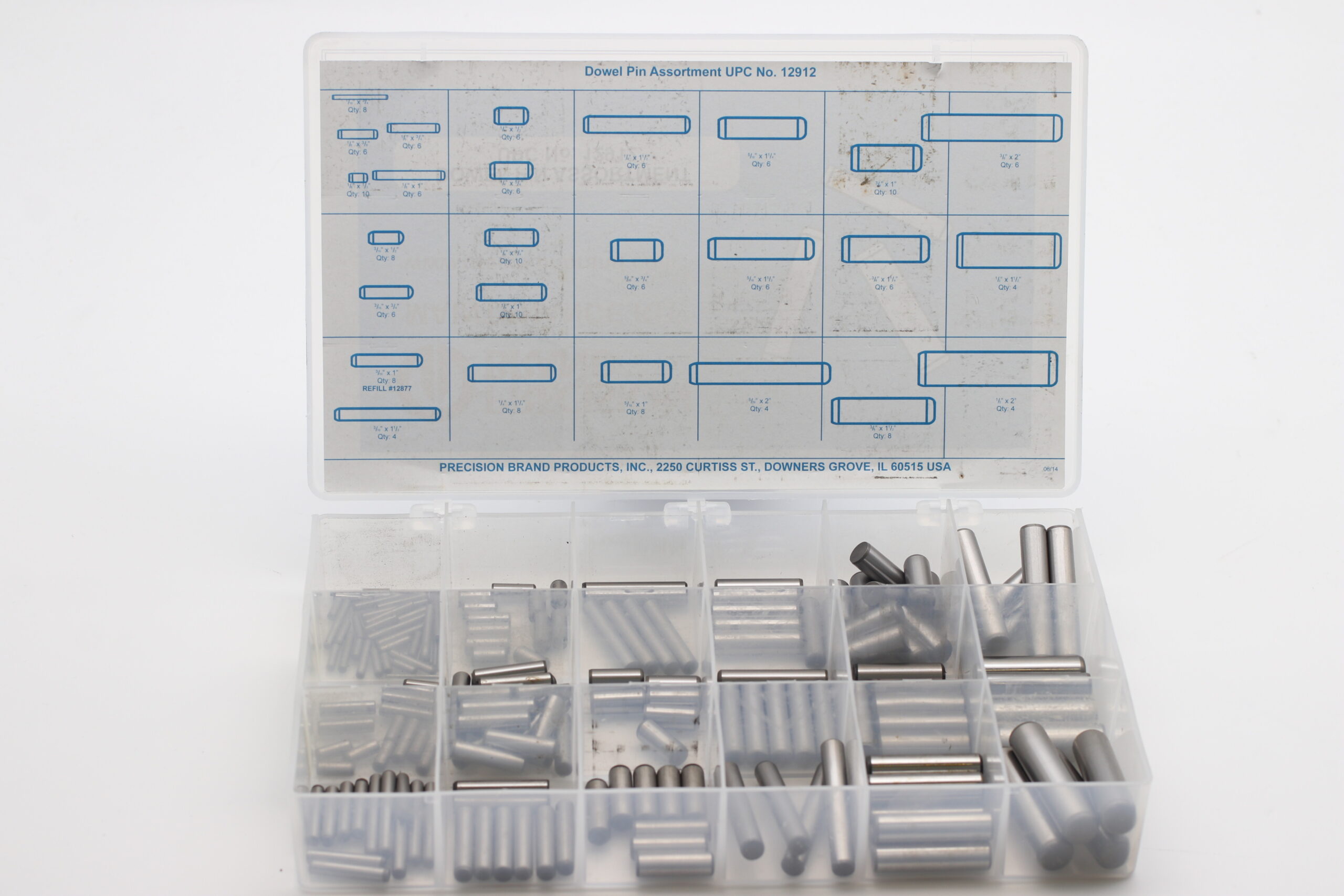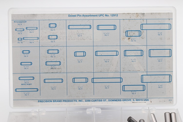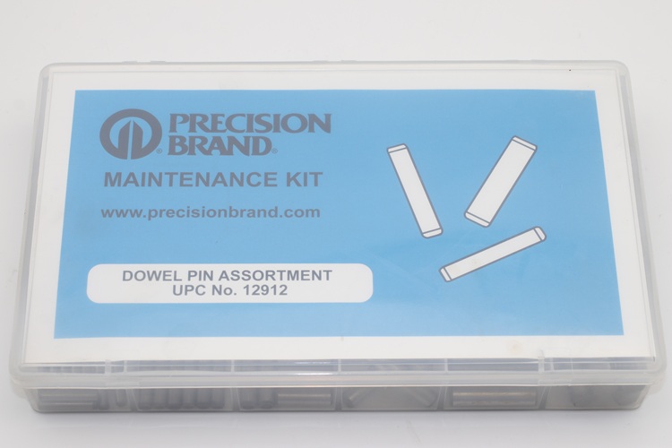 Precision Brand dowel pins have a plain finish and are made from alloy steel. They are used to retain parts in a fixed position or to preserve alignment when extreme accuracy is required. Precision Brand dowel pins are stored in well-labelled handy kits for shop tool room.