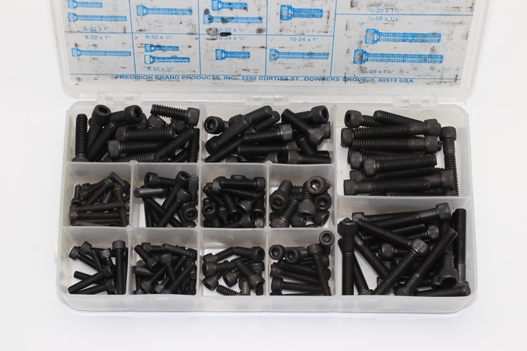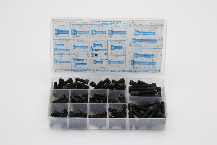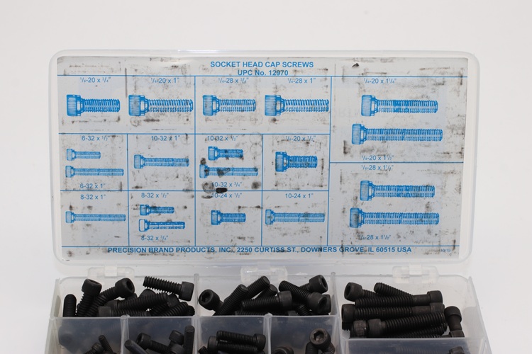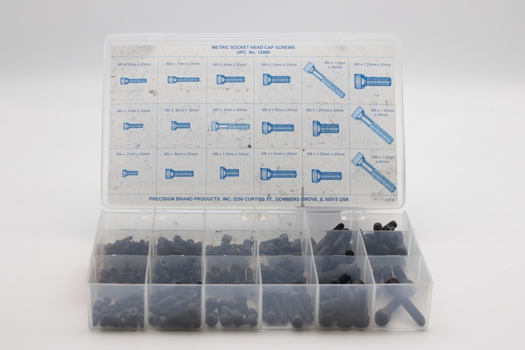 Socket Head Cap Screws supplied by Precision Brand are made of high grade alloy steel. Shown here are metric size cap screws with hexagon recessed heads. It is a handy kit for shop toolroom or toolbox. Having it on hand when needed saves time and money. Precision Brand socket head cap screws are stored in a well-labelled plastic compartment box for easy retrieval.