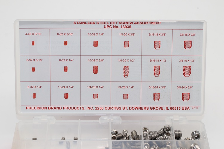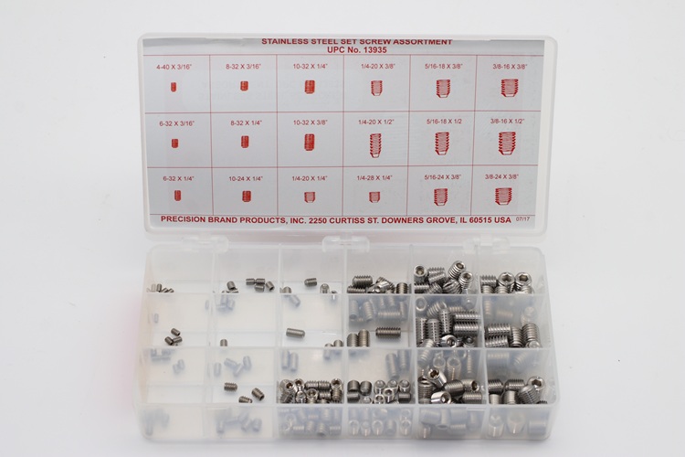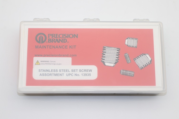 Use socket head set screws with cup point for positive torque. Precision Brand is able to supply these well-labelled handy kits for shop tool rooms. Keeping them on hand when needed saves time and money. Precision Brand socket head set screw assortment kits are packed neatly in a plastic box for easy retrieval.
