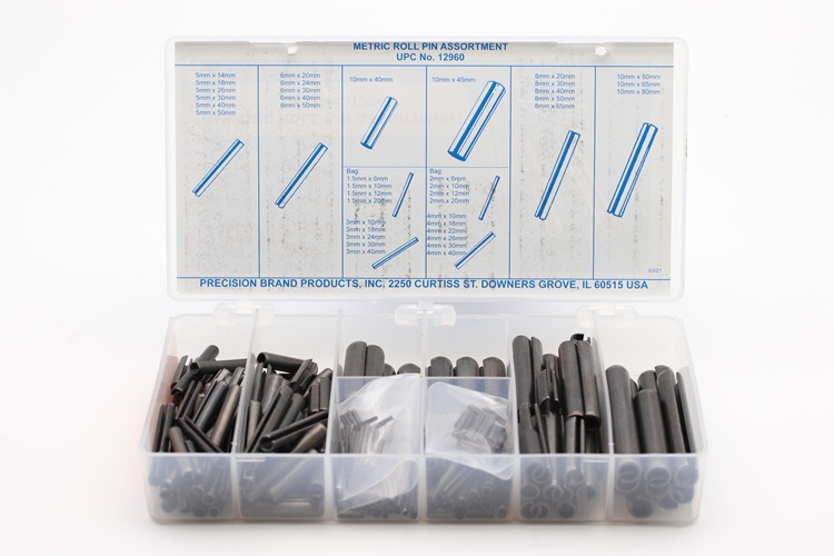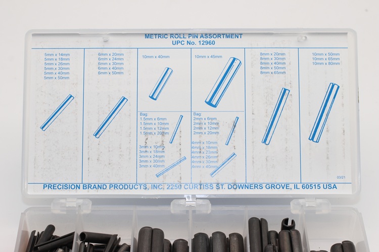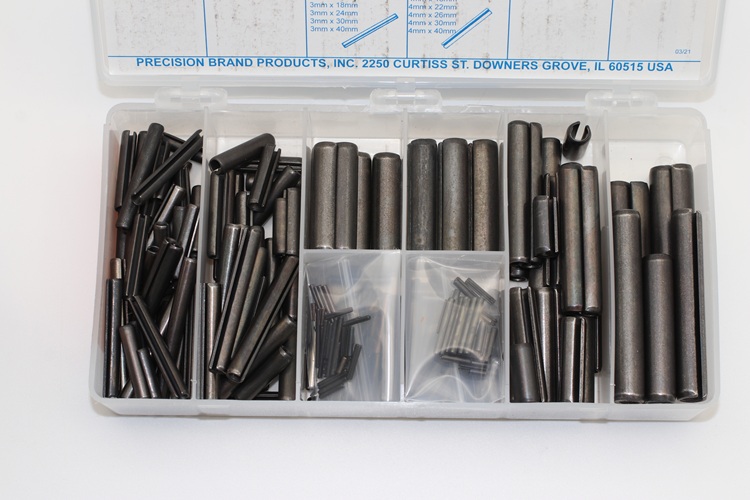 Precision Brand Roll Pins have chamfered ends to simplify the insertion process. These are stored in a well-labelled handy kit for shop toolroom. Having them on hand when needed saves time and money.