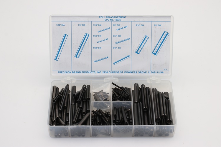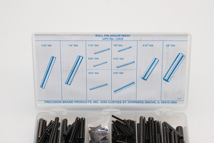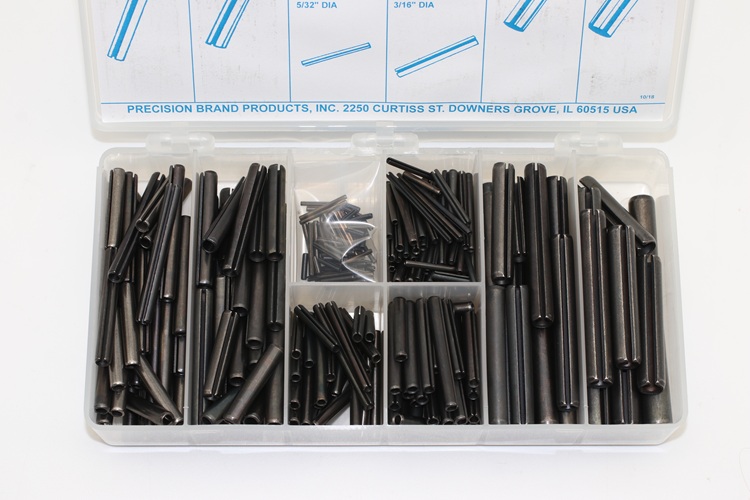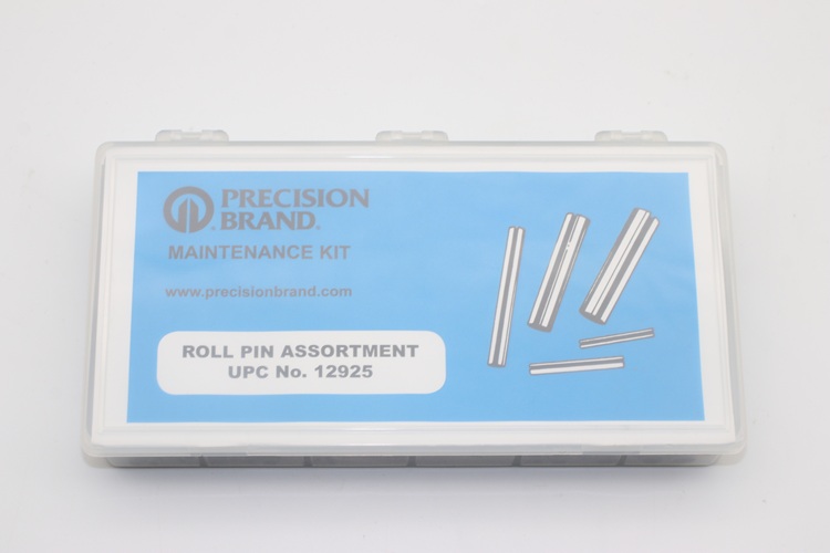 Precision Brand Roll Pins have chamfered ends to simplify the insertion process. These are stored in a well-labelled handy kit for shop toolroom. Having them on hand when needed saves time and money.