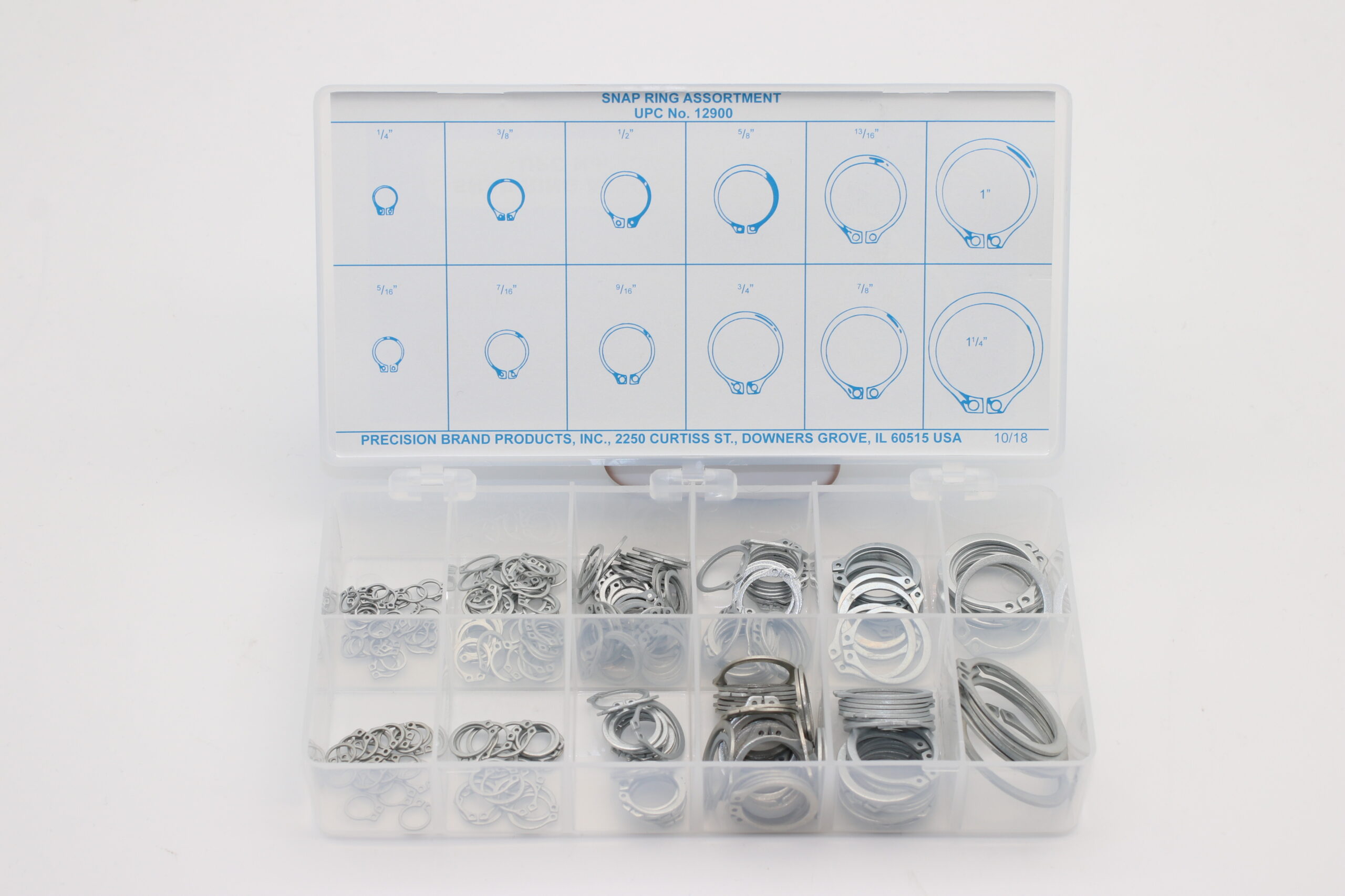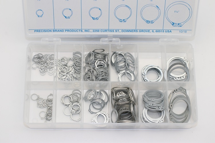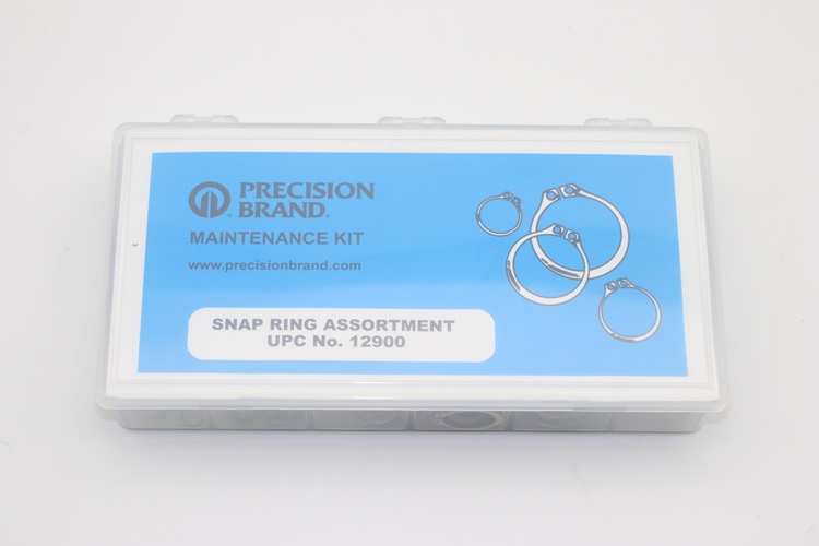 Precision Brand Snap Rings are external-based and made of spring steel with black phosphate coating. They are used to retain pulleys, gears or wheels on shafts. Precision Brand Snap Ring kits are handy for shop toolroom or toolbox. Having them on hand when needed saves time and money.