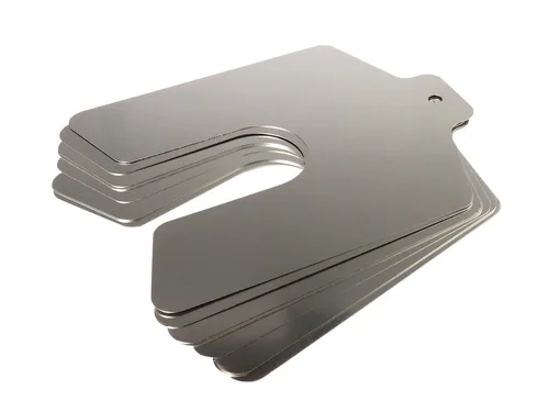Precision Brand® pre-cut slotted shims are made from a 300 series stainless steel that resists rust and corrosion. Precut shims have tabs that makes shim placement easier and safer, while eliminating the need to place hands under the machinery during installation or removal of shim. Each motor shim is marked with thickness in metric. Precision Brand® Slotted Shim is the best way to solve alignment and leveling problems on motors, pumps, generators, and other plant machinery.