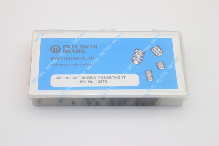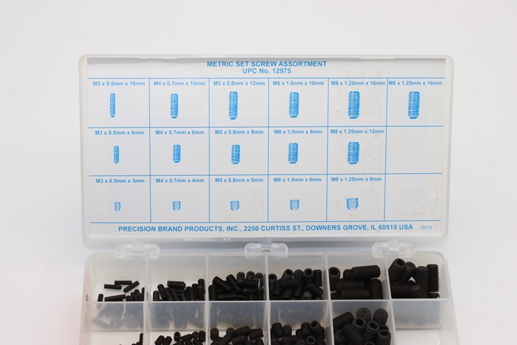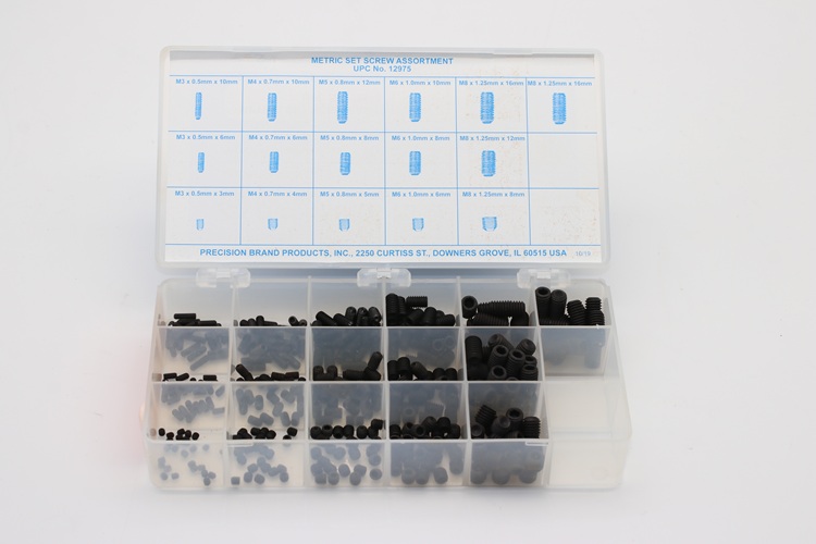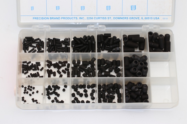 Use socket head set screws with cup point for positive torque. Precision Brand is able to supply these well-labelled handy kits for shop tool rooms. Keeping them on hand when needed saves time and money. Precision Brand socket head set screw assortment kits are packed neatly in a plastic box for easy retrieval.