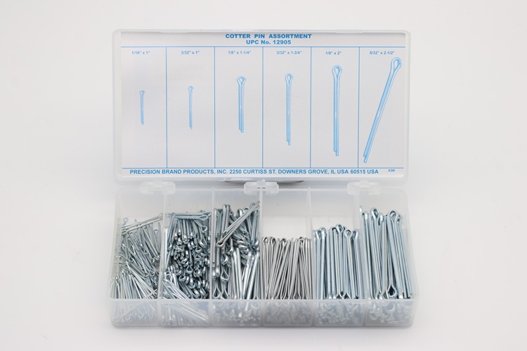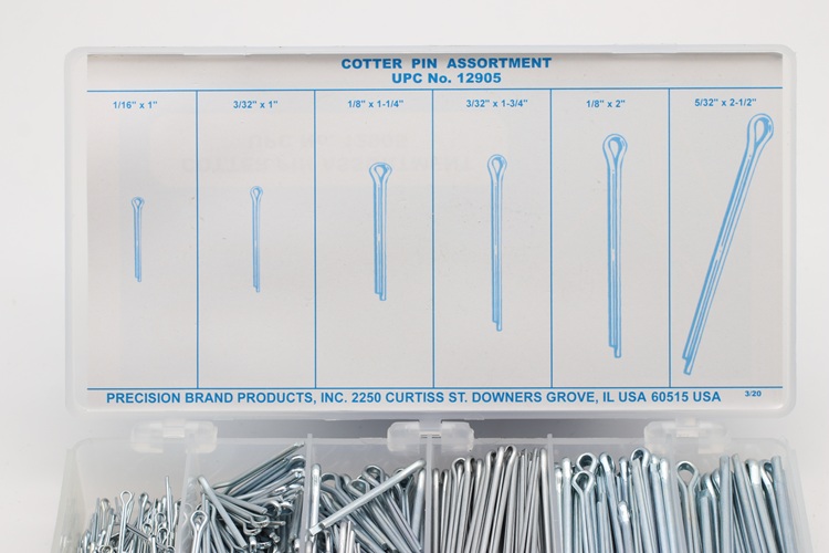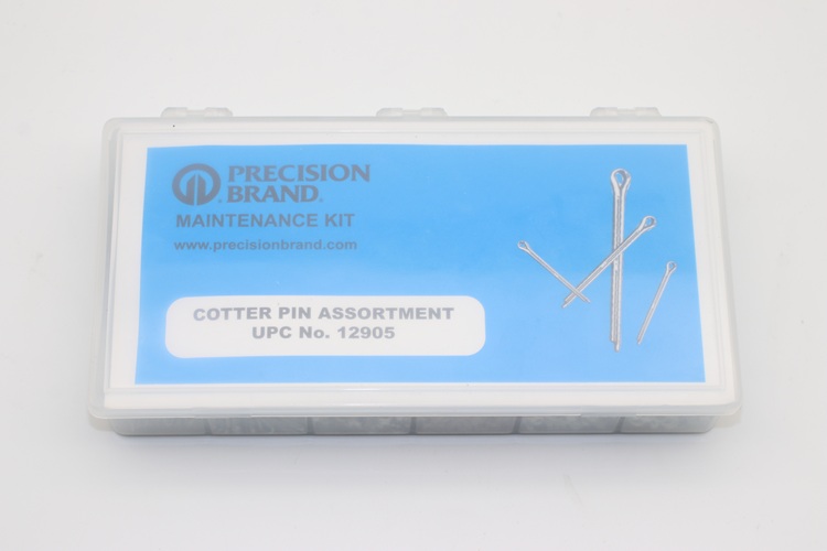 Precision Brand Cotter Pins have one prong extended for easy insertion and bending. These are stored in a well-labelled handy kit for shop tool room. Keeping them on hand when needed saves time and money.