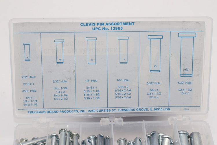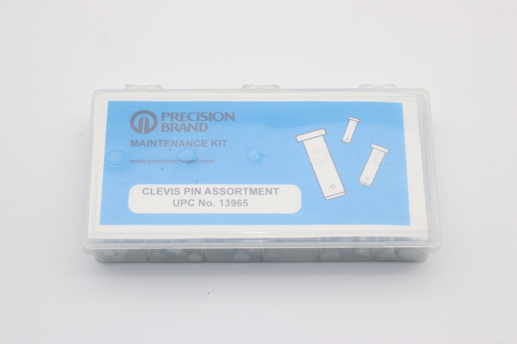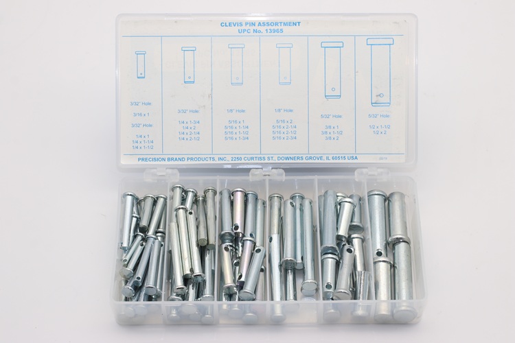 Precision Brand Clevis Pins are made from cold-formed low carbon steel. Their plated finish extends their working life while their chamfered hole allows for easy insertion. Precision Brand Clevis Pin assortment kits are stored in a well-labelled kit for shop toolroom. Having them on hand when needed saves time and money.