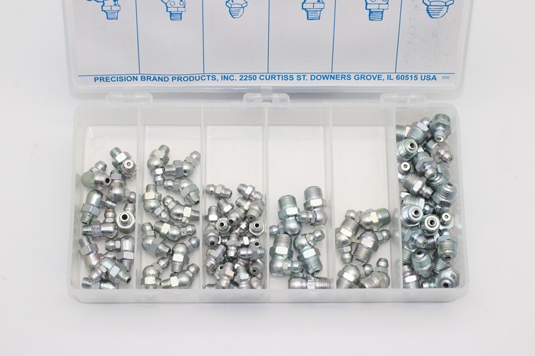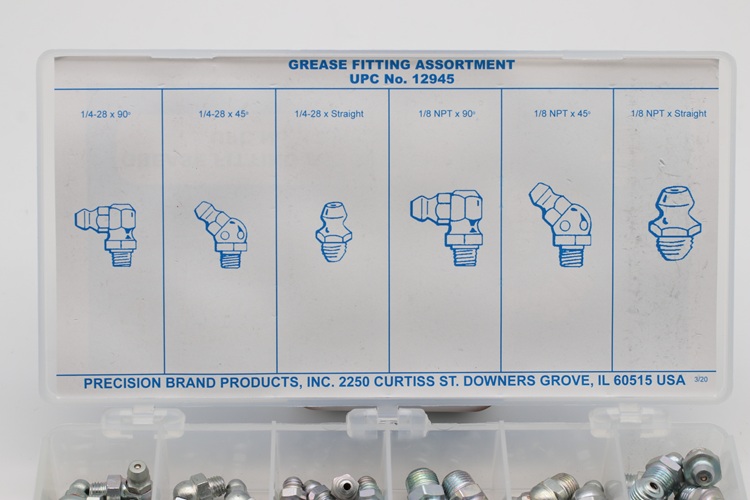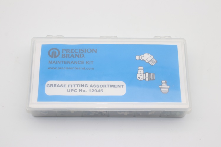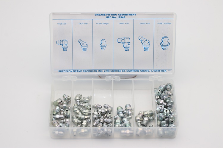 Precision Brand Grease Fitting kits contain push type and plated fittings that permit lubricants to flow. They also have a built-in ball with under spring pressure that prevents dirt from entering. It is a handy kit for shop toolroom. Having it on hand when needed saves time and money.