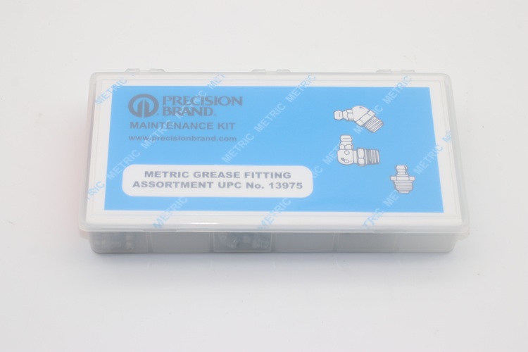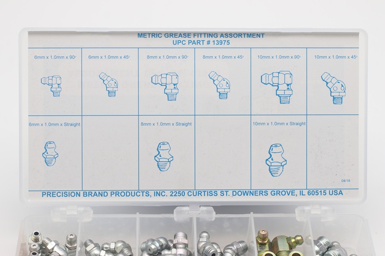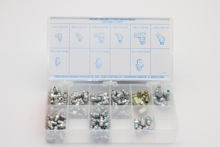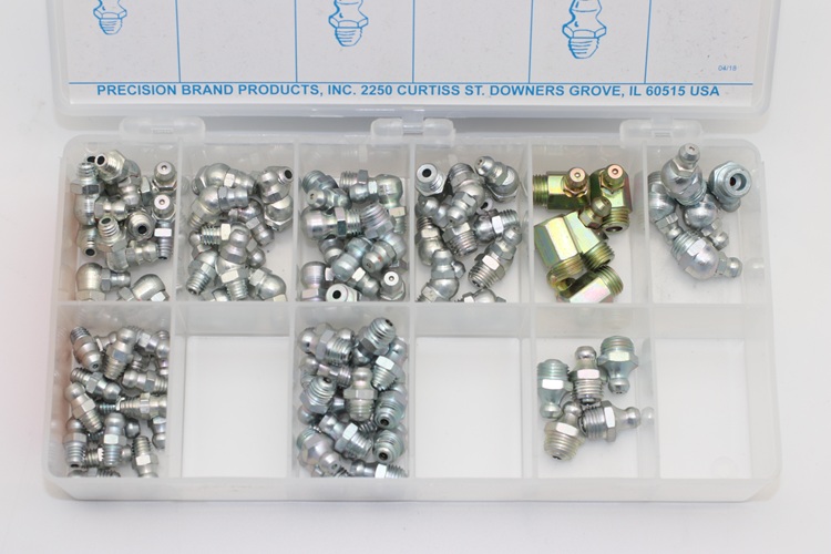 Precision Brand Grease Fitting kits contain push type and plated fittings that permit lubricants to flow. They also have a built-in ball with under spring pressure that prevents dirt from entering. It is a handy kit for shop toolroom. Having it on hand when needed saves time and money.