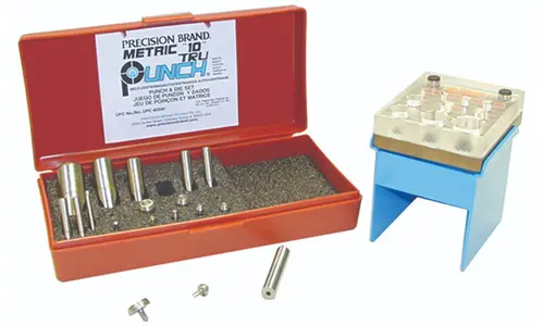 METRIC 10 TruPunch® by PRECISION BRAND is the first true metric self-centering punch and die set with stand.