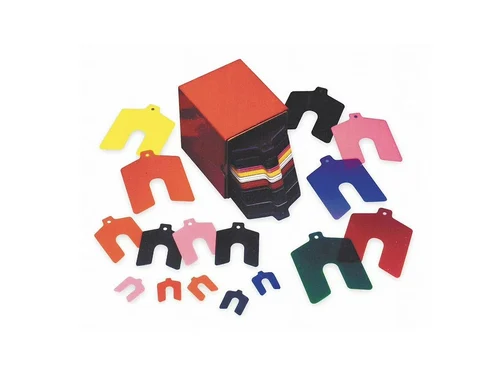 Made from a high quality, color coded, plastic material, that has minimal compression during use. Tab makes shim placement easier and safer, while eliminating the need to place hands under the machinery during installation or removal of shim. Each thickness is easily identified by its own color.