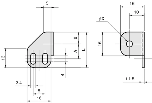 Type L Bracket, Right Mount, for Optical Fibre Sensors, M4, 54mm Long x 16mm Wide, Thickness 1.5mm, 304 Stainless Steel, FS04LJ040-S