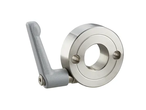 Wedge-lok shaft collars with clamping levers are simple to adjust for limited clamping spaces. The clamping lever is attached to the shaft collar and connected to an internal socket head cap screw. When the internal socket head cap screw is fastened, the Wedge-lok shaft collar secures itself onto the shaft