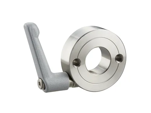Wedge-lok shaft collars with clamping levers are simple to adjust for limited clamping spaces. The clamping lever is attached to the shaft collar and connected to an internal socket head cap screw. When the internal socket head cap screw is fastened, the Wedge-lok shaft collar secures itself onto the shaft