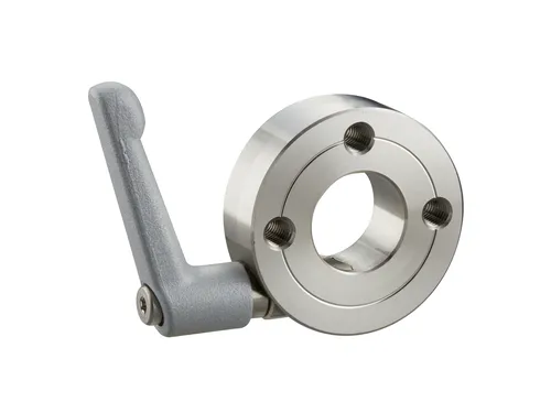 Wedge-lok shaft collars with clamping levers are simple to adjust for limited clamping spaces. The clamping lever is attached to the shaft collar and connected to an internal socket head cap screw. When the internal socket head cap screw is fastened, the Wedge-lok shaft collar secures itself onto the shaft